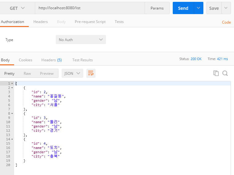 --> GET 요청을 보내면 아래와 같이 JSON형태로 응답이 넘어와야 한다.