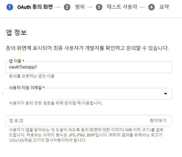 --> 앱 정보에는 아래와 같이 앱 이름과, 본인 구글 이메일 주소를 입력. 로고는 선택사항
