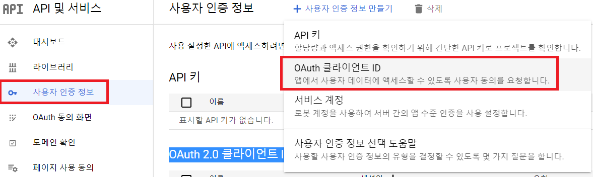 --> 사용자 인증 정보 만들기 -> OAuth 클라이언트 ID 클릭