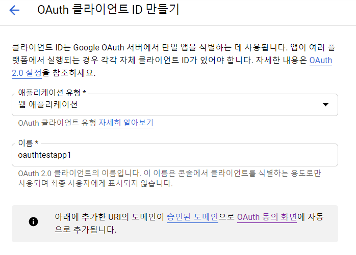 --> 웹 어플리케이션을 선택하고, 클라이언트 ID의 이름을 입력한다.