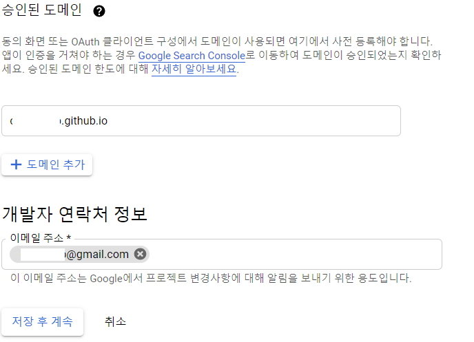 --> 승인된 도메인에는 githubpages 주소를 넣어주었다.