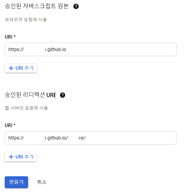 --> 승인된 리디렉션 URI에는 github pages의 실제 주소를 입력했다.