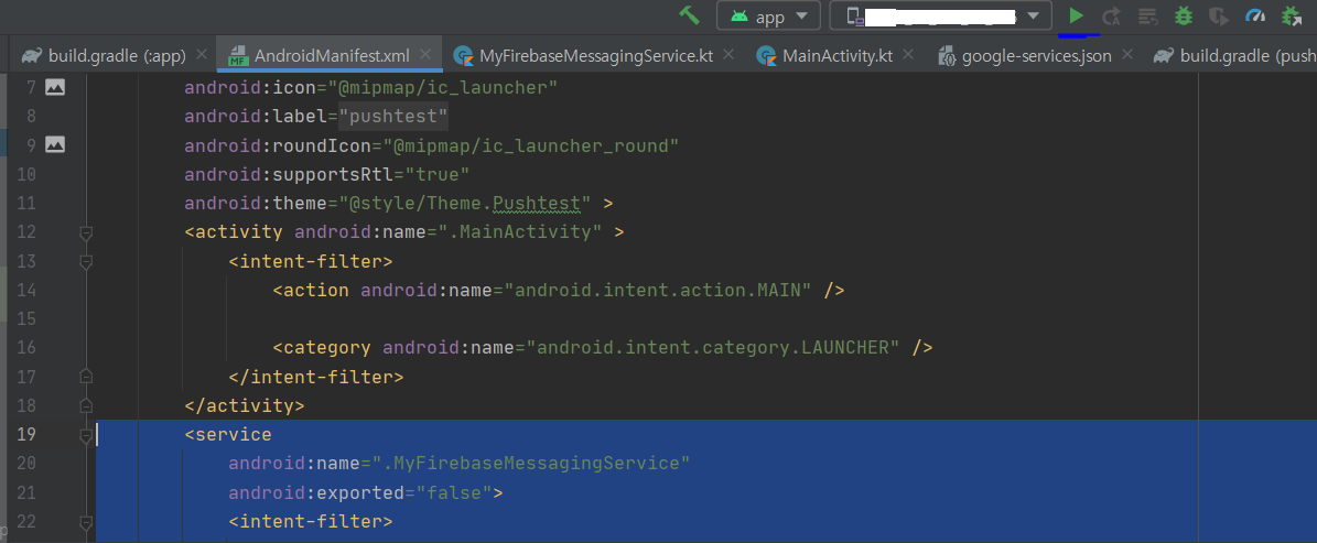 --> 이후 AndroidMenifest.xml의 <activity>태그 아래에 다음과 같이 <service>태그를 추가해준다.)