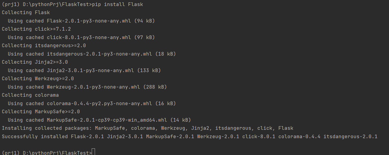 --> 아래 명령어를 입력하여 Flask 를 설치한다. 큰 오류 없이 설치가 완료될 것이다.