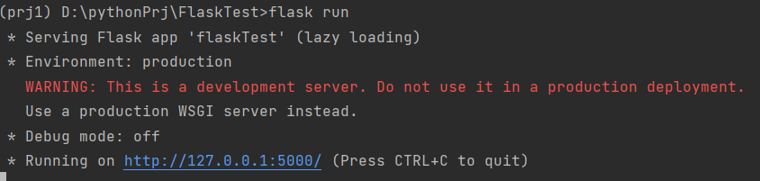 (2) 개발 환경을 development 로 설정해주어야 한다. 최초 프로젝트 생성 후 FLASK_ENV 환경변수는 Default가 production으로 되어있다. 이 상태로 서버를 구동해도 무방하나, 경고문이 발생한다. (운영 환경에서는 개발하지 말라는 선조들의 경험에서 나오는 경고문인듯..)
