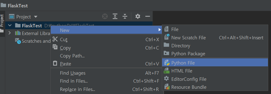 --> 설치가 완료되었으면 Flask를 구동할 파일 하나를 생성한다. flaskTest라는 파이썬 파일을 만들것이다.