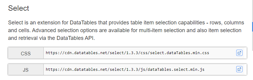 Select Select adds item selection capabilities to a DataTable. Items can be rows, columns or cells, which can be selected independently, or together. Item selection can be particularly useful in interactive tables where users can perform some action on the