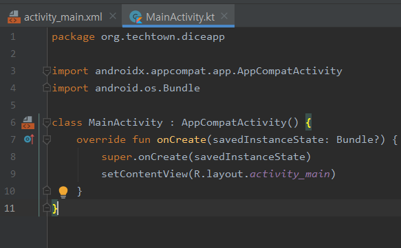◆ MainActivity.kt의 모습. kotlin의 function을 나타내는 지시자 fun 이 보인다.