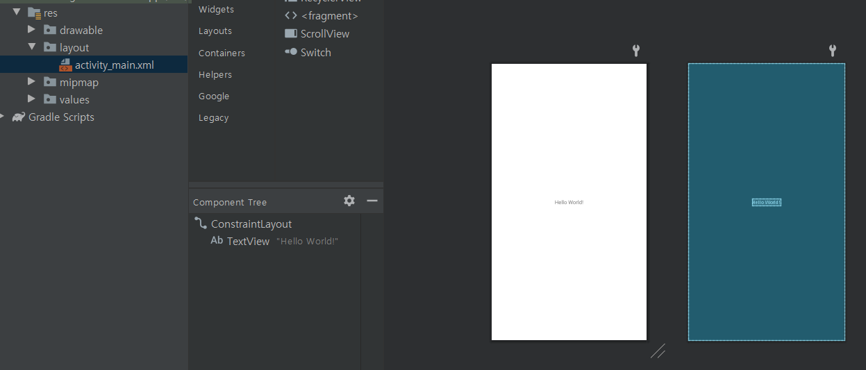 ◆ 템플릿에 의해 Hello World 라고 적혀있는 TextView가 하나 생성되어있는것을 볼 수 있다.