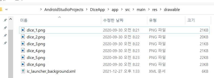 ◆ drawable폴더 내의 이미지는 R.drawable.dice_2와 같이 불러올 수 있다.