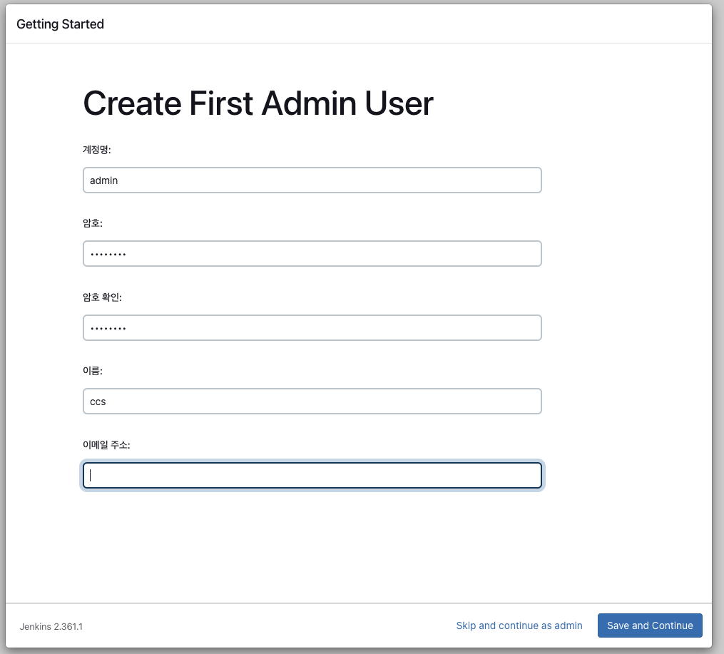 - 플러그인 설치 완료 후 관리자 계정을 생성한다