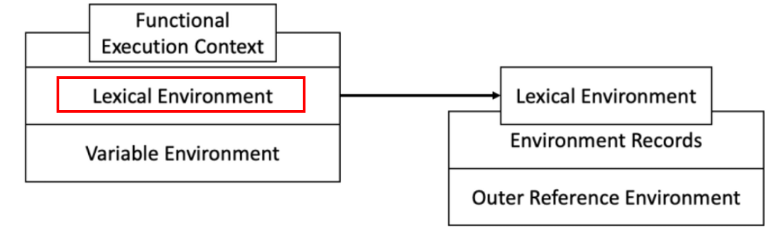- 렉시컬 환경은 환경 기록(Environment Records) 와 외부 렉시컬 환경에 대한 참조(Outer Reference Environment) 로 구성되는데