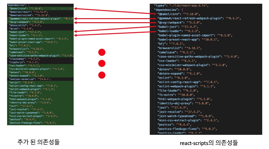 - 또한 package.json을 보면 의존성들도 상당히 많이 추가되는 것을 볼 수 있는데,