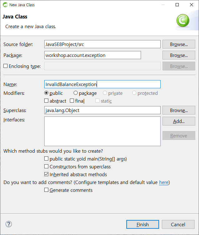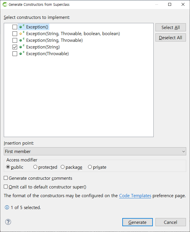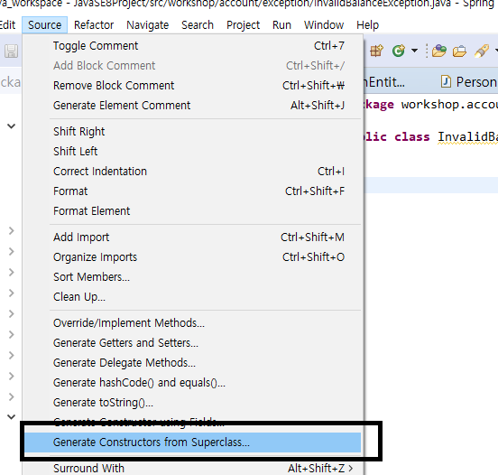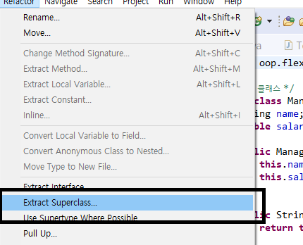 이렇게 슈퍼클래스 만들 클래스를 선택한 후에 Refactoring -> Extract Superclass 하면, 상속되는 코드가 자동 삽입되고 Super 클래스가 생성된다.