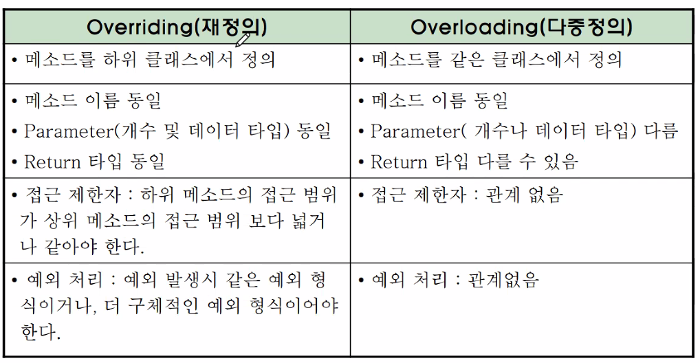 자식클래스에서 동명의 메서드가 각각의 역할대로 선언/정의 되어있을때