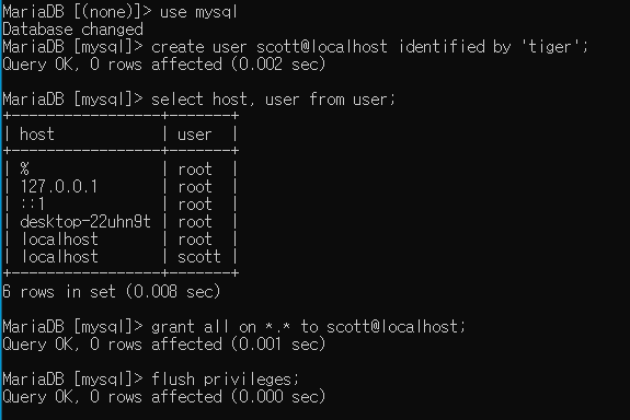 grant all on *.* to scott@localhost; --> 사용자에게 권한을 줌..