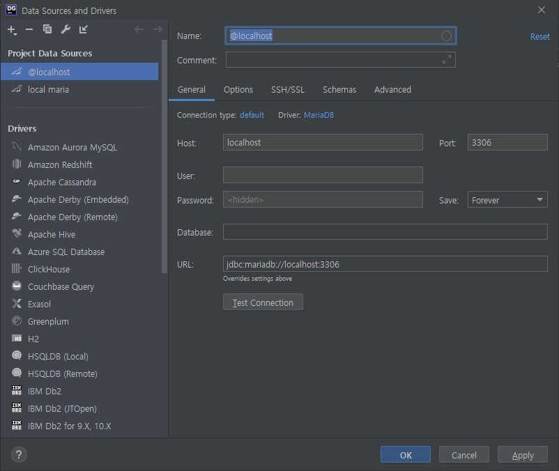 Test Connection 을 해서 초록색 체크표시가 뜨면 성공..