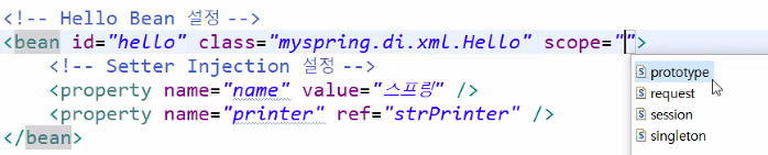 <bean id="hello" class="myspring.di.xml.Hello" scope="singleton">