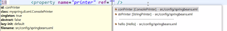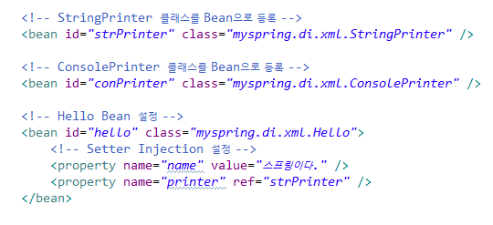 여기서.. <property name="printer" ref="strPrinter" /> 는 속성 중에 ref가 있는 것을 볼 수 있다.