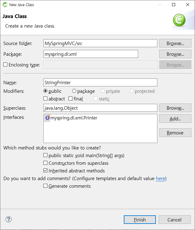 StringPirnter클래스 하나 만들고, 방금전 만든 프린터 인터페이스를 추가..