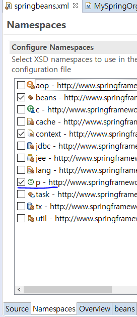springbeans.xml 에서 저 p라는 namespace를 체크하면..