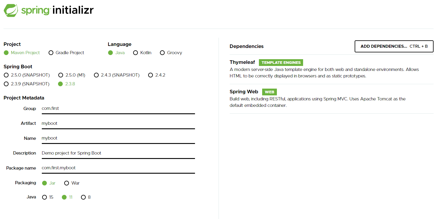 Dependency로 spring web을 꼭 넣어줘야 한다.