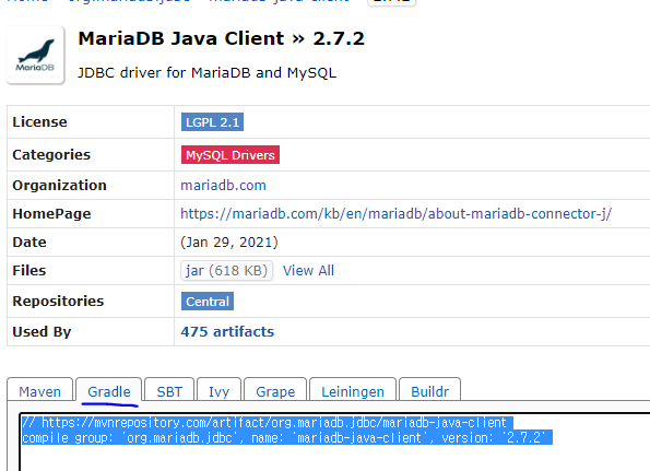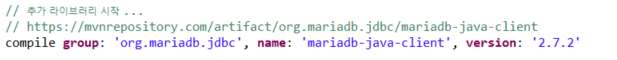 이후 Maria DB 쓰기 위해 maven repository에서 mariadb-java-client 설치해준다.