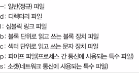 - 일반 파일, 디렉터리, 심볼릭 링크, 장치파일로 구분