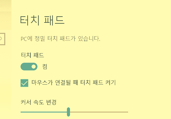 --> 설정-> 장치 -> 마우스 탭에 진입하면 아래와 같은 터치패드 속성을 볼 수 있습니다.