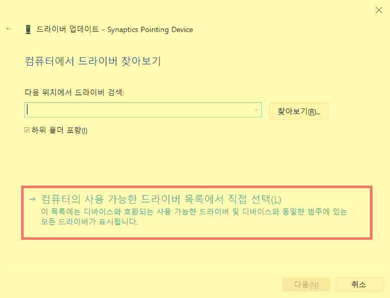 터치패드의 SW(드라이버)를 강제 업데이트하여 이를 편법으로 사용하는 방법을 공유해보고자 합니다.