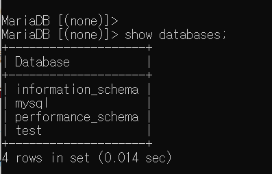 아까 설치할 때 입력했던 root 비밀번호를 입력하면 DB에 접근할 수 있다.